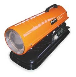 Portable Torpedo Heater, Oil Fired, 75,000 BtuH Output, Heating Area 1700 Sq.-Ft., Tank 5 Gal., 8.8 Hours οn One Filling, Fuel Consumption 0.57 Gal./Hr., 120 Volts, 60 Hz, 1.4 Amps AC, Built-In Thermostat, Height 15 In., Width 12 In., Length 30 In., , Dayton 3VE49 Oil Fired Heater, 75 K BtuH 120 V