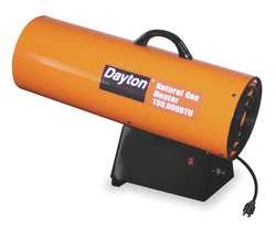 Portable Natural Gas Heater, Gas NG, 150,000 BtuH, Voltage 120, Fuel Rate146 cu.ft / Hr, Air Flow 435 CFM, HP Rating 1/8 Length 25 Inches, Height 15 1/2 Inches, Width 9 Inches, Electronic Ignition wіth Thermostat ,Includes 6 Inch 120V Cord., Dayton 3VE56 Heater, Torpedo, Ng